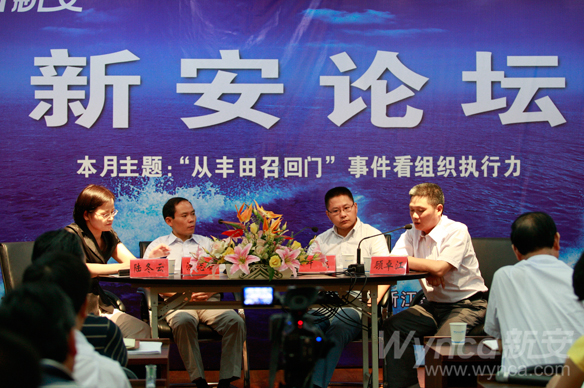 7月25日,第二期新安論壇在九樓會議室如期開講,本期論壇的主題為“從‘豐田召回門’事件看組織執(zhí)行力”,洪志標、葉飛、顧卓江、吳啟壽、方晗、胡志紅6嘉賓在主持人陸冬云的引導串接中,從各自的工作角度出發(fā),圍繞如何在公司內(nèi)提升組織執(zhí)行力這一內(nèi)容發(fā)表觀點。公司領導王偉、潘秋友、林加善、任不凡、姜永平、周家海、包雪傳和70余名公司中層干部現(xiàn)場聽取嘉賓觀點。